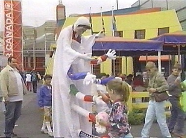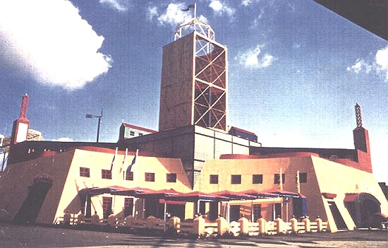 ALBERTA PAVILION The bright colours and post-modern design of Alberta's 7 storey tower made the pavilion an Expo landmark. Depending on the angle, the pavilion appeared to be a group of grain elevators, a church steeple or an oil rig. This pavilion was all about illusion. It was not uncommon to see mountain climbers scaling the tower one day and a stuffed mountain goat peeking over the roof the next. At night, images were projected on the tower. Inside, visitors found themselves in unpredictable and humorous situations. By peering through tiny windows on a cityscape sculpture people became instant peeping toms. Miniature video monitors within the buildings showed Albertans going about their daily business -- including a woman in the process of undressing.