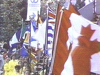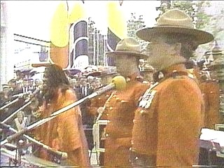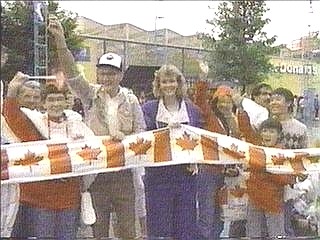 The festivities started with a parade.  After, two runners with umbrellas in hand unferled a long (waterproof) banner that crisscrossed the entire Expo site ( I think it was to hold the Guiness world's record as the longest banner, but I could be mistaken).  People were asked to hold on to the banner as a symbol of Canadian unity.