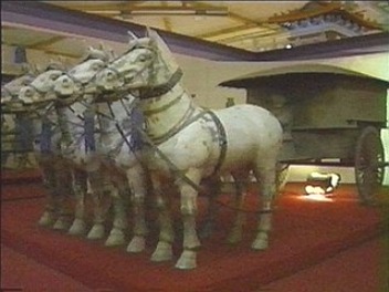 Once inside the pavilion, visitors could view such modern technological innovations as a communications satellite, a rocket, a ground receiving station and a marine surveying ship. Jumping back in time to the Ming Dynasty, a model of explorer Zhen He's flagship displayed China's lead in navigation a century before Christopher Columbus and Magellan. A few steps ahead the visitor came to a 2000 year old bronze chariot. Unearthed in 1980, this was the largest, most complete and oldest among the chariots excavated to that date. The famous terra-cotta statues unearthed from the grave of Qin Shi Huang stood on both sides.
