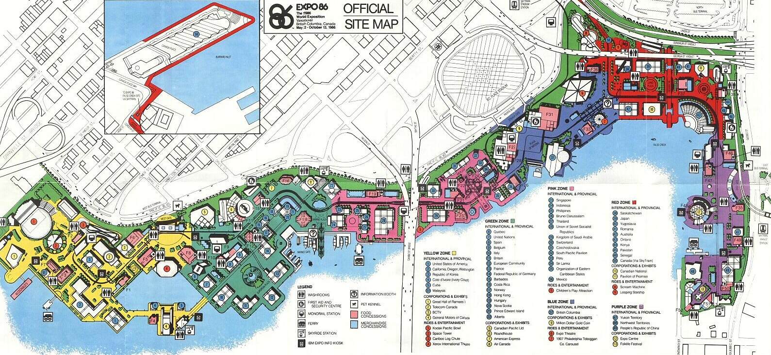 AIR CANADA ALBERTA AUSTRALIA BARBADOS BCTV BELGIUM BRITAIN BRITISH COLUMBIA BRUNEI DARUSSALAM CALIFORNIA CANADA CANADIAN PACIFIC CANADIAN NATIONAL CHINA COSTA RICA CUBA CZECHOSLOVAKIA EASTERN CARIBBEAN EUROPEAN COMMUNITY EXPO CENTRE FRANCE GENERAL MOTORS (Spirit Lodge) GERMANY GREAT HALL OF RAMSES II GREAT NORWEGIAN EXPLORERS HONG KONG HUNGARY INDONESIA ITALY IVORY COAST JAPAN KENYA KOREA MALAYSIA MEXICO NORTHWEST TERRITORIES NORWAY NOVA SCOTIA ONTARIO OREGON PAKISTAN PAVILION OF PROMISE PERU PHILIPPINES PRINCE EDWARD ISLAND QUEBEC ROMANIA THE ROUNDHOUSE SASKATCHEWAN SAUDI ARABIA SENEGAL SINGAPORE SOUTH PACIFIC SPAIN SRI LANKA SWITZERLAND THAILAND U.S.S.R. UNITED STATES WASHINGTON YUGOSLAVIA YUKON TERRITORY AIR PLAZA LAND PLAZA MARINE PLAZA HIGHWAY 86 UFO H2O FOLKLIFE EXPO THEATRE KODAK PACIFIC BOWL XEROX INTERNATIONAL THEATRE PLAZA OF NATIONS PACIFIC STATION THE UNICORN McBARGE BAVARIAN BEER GARDEN MUNICH FESTHAUS SPACE DROP HSST SCREAM MACHINE CARIBOO LOG CHUTE CARROUSEL LOOPING STARSHIP UNITED NATIONS