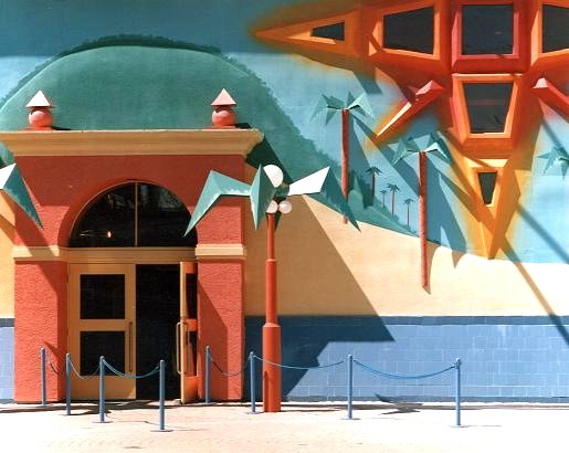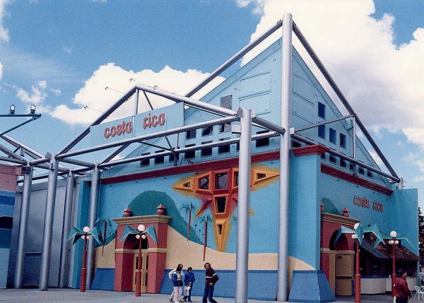 COSTA RICA PAVILION ![]() The Costa Rica Pavilion was cleverly designed as a three dimensional postcard. Visitors walked through a scene of palm trees, sun, sand and blue water and into a lush green tropical forest. A message to visitors complete with an enormous stamp was on the flip side of the postcard behind the pavilion. ![]() A coffee shop