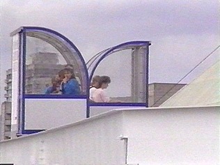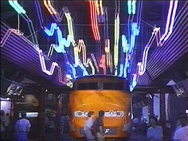 Visitors could enter or leave the France Pavilion on the "People Mover."  Situated on an elevated track, the light weight tranportation system was billed as a prototype that could eventually be fitted for use in airports and urban centres.