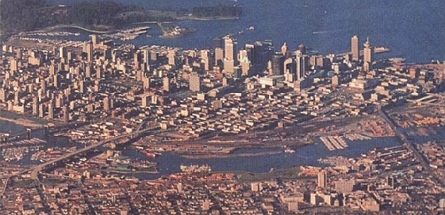 be in itself a transportation milestone. The Site Originally, the world's fair was to be held on the grounds of the Pacific National Exhibition. The PNE was to receive a facelift, new modern pavilions and a monorail to the downtown core. This idea would sound familiar to the people of Seattle. The original design of Expo 86 was almost a mirror image to the World's fair of 1962. During this time, Vancouver was negotiating to buy back land on the north shore of False Creek from the Canadian Pacific Railroad. A century of heavy industry turned the area into an eyesore. But the south side of False Creek had successfully been developed into housing communities, parks and a public market during the "city beautiful" movement of the 1970s. The same type of urban renewal project was proposed for the north shore along with a 60,000 seat covered stadium. ![]() (False Creek and downtown Vancouver in the 1970s) Vancouver's city council wasn't receptive to the False Creek Plan. They were looking north to the picture perfect setting seen on many postcards, namely Coal/inner harbour. That area was next door to tourist destinations and the hub of the city. The harbour was also the area where the city council thought legacy structures could best be used afterwards. The hit television show "Love Boat" filmed a season premiere episode on location in Vancouver complete with scenes at the old, dilapidated Balintine Pier where cruise ships docked at the time. To say the least, the TV episode shown around the world was not entirely flattering to Vancouver. So, in the City Council's eyes, a World's Fair had to bring in some permanent structures that would beautify the city. The "wish list" included a large convention centre, a waterfront park and fountain, and of course, a new cruise ship terminal. But the problem with the inner harbour was land availability. In order to host a fair in that area, extensive land fill projects or a compromise on the size of the fair were in order.