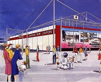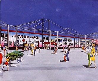 The artist's rendering above shows the 8 modules (2 rows of 4) that made up Japan's pavilion. While many countries opted for elaborate exterior decoration, Japan's designers decided to keep the module's structural integrity exposed. Why the Module? Expo 86 was simply the first phase of the largest urban renewal project to take place in North America. It was clear from the beginning that only a few permanent structures would remain after the fair. The module was an inexpensive way to create a large, indoor space. As they were prefabricated, the modules could be set up and removed quickly with a minimum amount of labour or stress to the environment. The module was also designed to have a high resale value. Although sturdy, the light weight structures could be sold, shipped and easily reassembled to fit most any landscape. Pavilion Size In one case, a few countries banded together to share one module. Most countries used one or more modules to create their pavilions. The largest use of the module included: 14