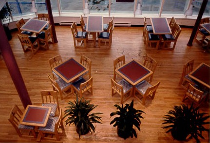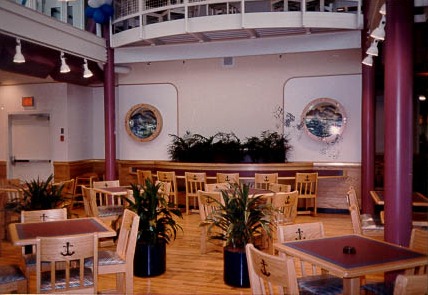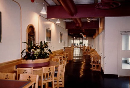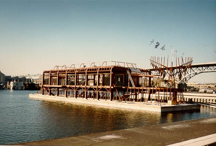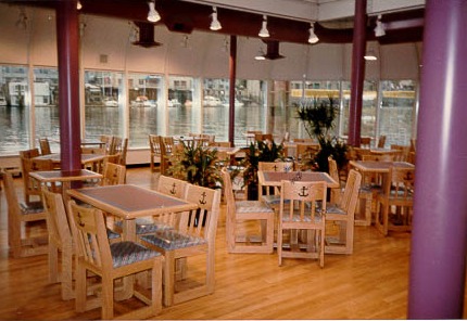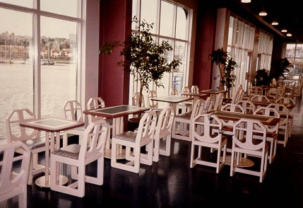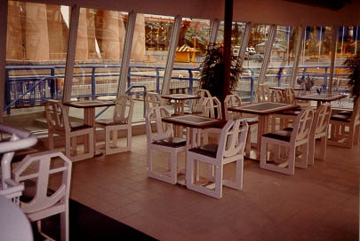 There was a shift in public attitude during that time. The Yuppies were forsaking all things blatantly cheap. Hot-dogs, diners and the Five and Dime were out. Quiche, Bistros and boutiques were in. McDonalds, a company that prided itself on affordability, was loosing a part of the young adult market to eating establishments that portrayed themselves as high brow. Because of this, McDonalds tried out a new concept in 1986 -- "affordable elegance." Their flagship restaurant at Expo 86 was built more in the style of a bistro than a McDonald's. Because it was a costly venture, the McDonalds was built as a floating restaurant so it could be easily moved to another location. Click on the pictures below to enlarge. The McBarge featured garden rooms, tasteful art and panoramic views of Expo 86. A unique feature to this McDonald's was a hidden kitchen. Burgers and fries were delivered to the front counter by way of a conveyer belt. After the fair, the company wanted to find a permanent home for the McBarge but all proposed sites were turned down. Today, the McBarge is anchored just offshore in Burrard Inslet. Click