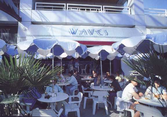 The futuristic portal of Pacific Station led to three caberets/nightclubs. By day, casual dining and free entertainment was offered, but after the sun set, it was non-stop music and dance-till-you-drop action. Each venue was themed on the different modes of travel -- air, sea and land. For those with a sense of adventure, The Flying Club's aviation decor allowed its dinner theatre guests to sit above the clouds on the wing of an airplane while watching Vaudeville style shows, Theatre sports and Second City comedy. Waves presented round-the-clock entertainment in the tropical atmosphere of an ocean cruise. It featured a clear, plexiglas floor/aquarium with fish swimming underneath your feet.