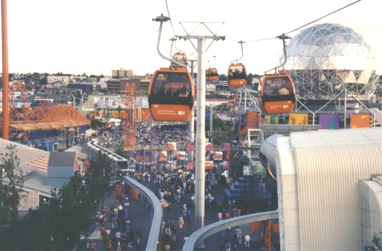 The Purple Zone, bordered by Quebec Street and the shores of False Creek, was situated on the far east corner of the fair. Many people consitered this Zone to be the soul of Expo 86 due to the fact that it housed two of the most popular theme attractions -- Folklife and Expo Centre. Expo Center was planned to be converted into a Science Centre after the fair and its placement at the foot of Terminal Avenue was agreed well in advance. The area was also the site of Skytrain's Main Street Station and just across the street from Vancouver's historic train terminal. With all this in mind, an idea was formed to allow visitors a single vantagepoint to view all of Expo's modes of transportation in action.