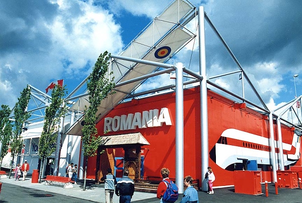 ROMANIA PAVILION ![]() From the Official guide: The Romania Pavilion reflects the nation's historic role in the trade routes of the Middle East to northern and central Europe. Even today, international ocean-going vessels follow Viking trails to access eight countries within the continent. From the Black Sea, ships follow the well-travelled Danube River which forms Romania's southern border. Romania produces much of its own transportation equipment including railway carriages, locomotives, electric engines and transformers, farm machinery including tractors and trucks, as well as ships and boats, airplanes and helicopters. A major landmark of Romania's modern era is the 1984 opening of the 64 kilometre long Danube-Black Sea Canal. This waterway shortens the route to central Europe by 400 kilometers and eases the ecological impact of the Danube Delta which is now being developed for agriculture, fishing and tourism. Romania's natural resources are abundant and the southeastern European nation has developed an industrialized economy. From the Best of Expo guide: At the entrance to this pavilion you are greeted by a large picture of Romania's leader. Coupling transportation and production statistics, Romania seeks to tell you all about its industries. Highlights
