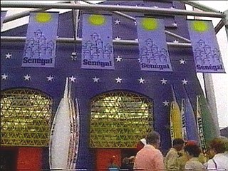 The Senegal Pavilion has as its theme the traditional sectors of fishing and agriculture, as well as this country's role as ambassador of African art. The blue and white exterior symbolizes the importance of Senegal as a fishing coast of West Africa. At the entrance, bright ocean-going pirogues (canoes) are found. Inside, the visitor enters a village symbolic of traditional archicture. Within this scenic setting guests view not only transportation and communications, but also the great agri-industrial potential of the country. The pavilion offers a picture of modern Senegal through displays of its railways, the Atlantic port of Dakar, on of the largest in Africa, the Transport Company of Cap-Vert and the National Telecommunications Company. Traditional tapestries stand in contrast to original and modern graphic and visual works, reflecting a tradition rich in ethnic diversity. From the Best of Expo guide: The essence of this pavilion is the structure used to display the exhibits. Walls simulating the coloured mud huts of a village display the exhibits. You wind through the village to the accompaniment of music from Senegal. Highlights